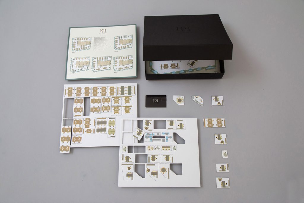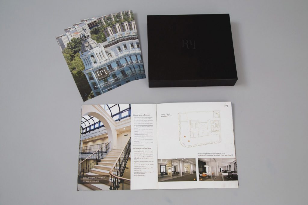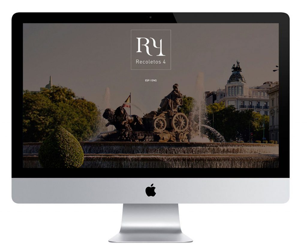 Identity and naming, logo design, shooting, website, advertising piece, showroom decoration, façade canvas, and luxury brochure with a customised USB for the Recoletos 4 building.
