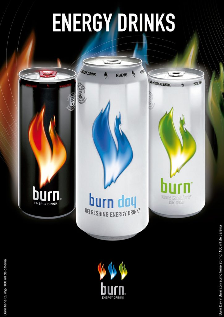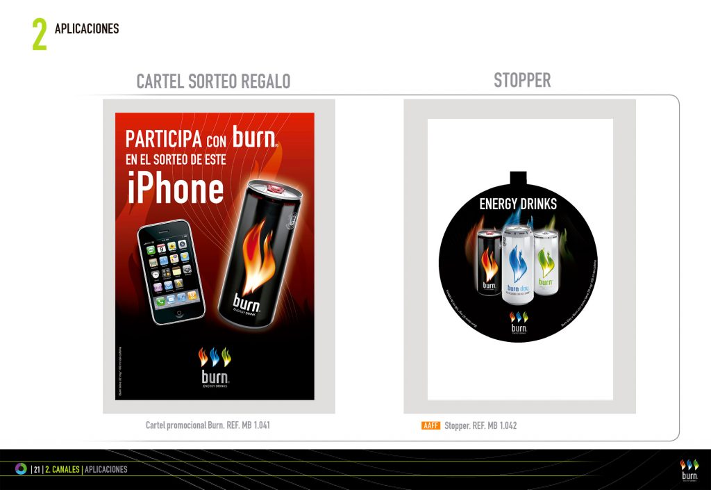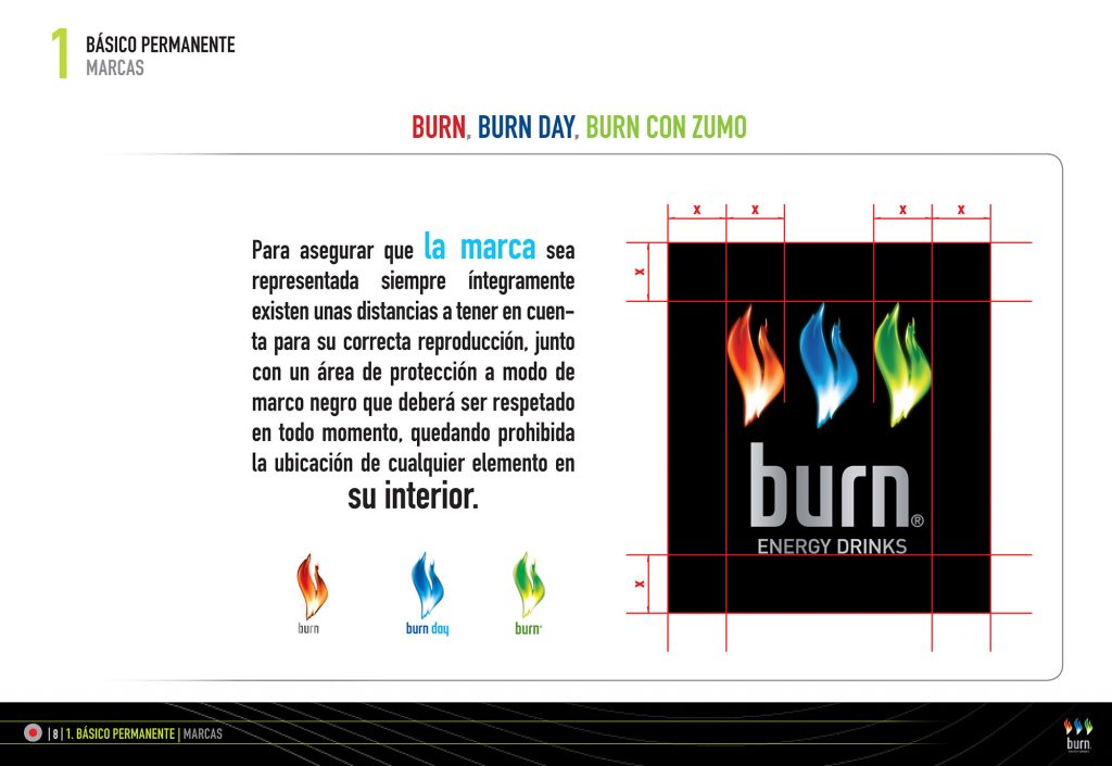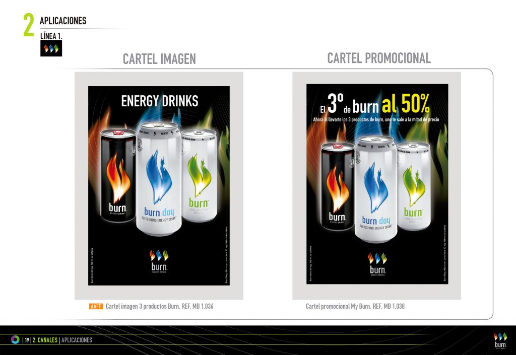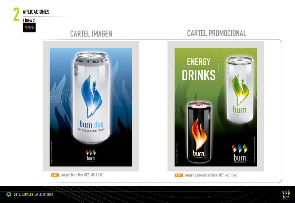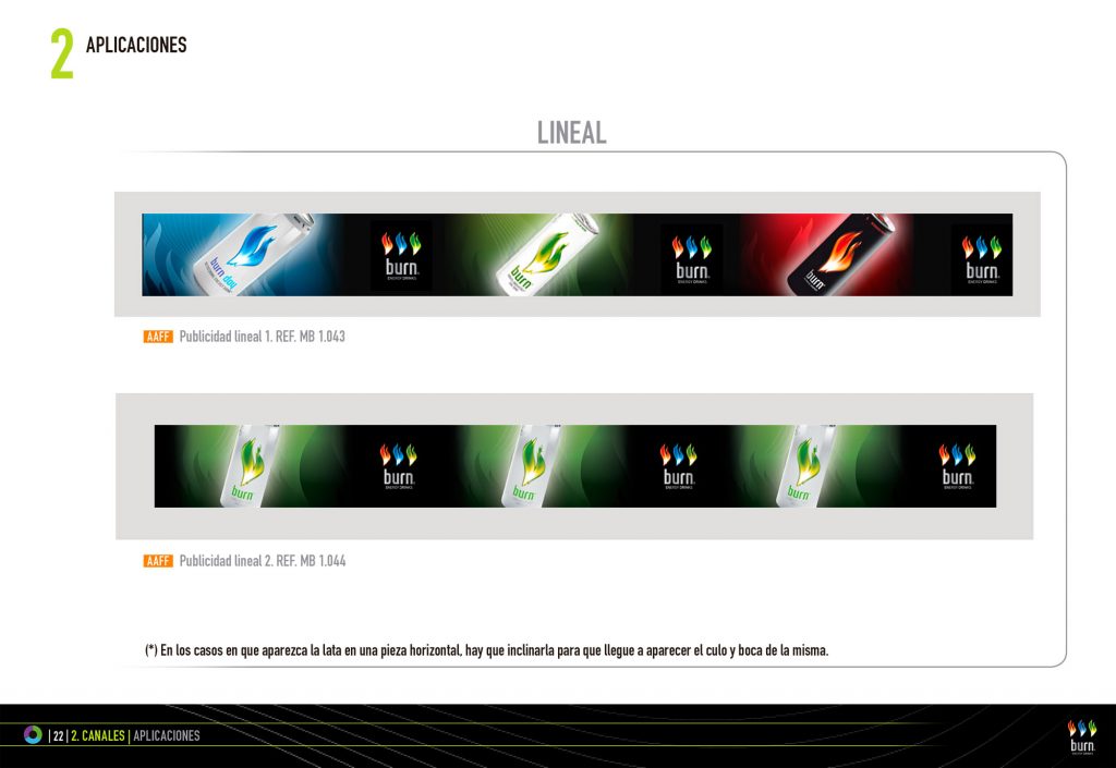 Visual identity manual design for Burn, Coca-Cola. Visual identity elements design for the brand, as well as graphic application on different promotional elements.